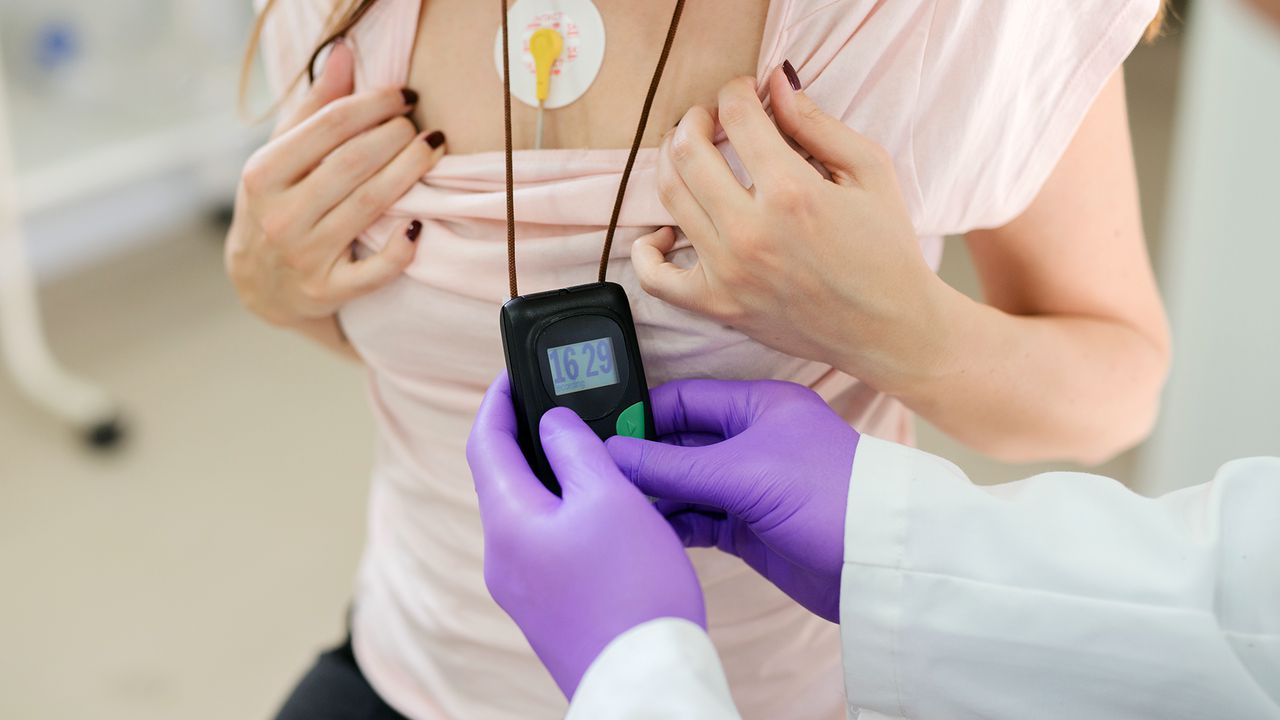 What's the monitoring device like? There are a few types, and they do different types of monitoring. Most have electrodes that attach to the skin of your chest with sticky pads. Wires go from the electrodes to a small electronic device that stores the data. Commonly, this device is worn on a belt or on a strap.