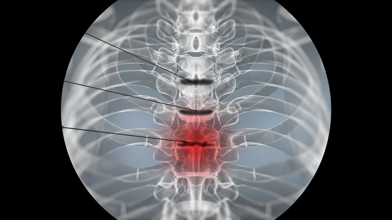 The doctor uses a video x-ray device called a "fluoroscope" to carefully guide a needle into the target disc. If more than one disc is being tested, a needle is placed into each one.