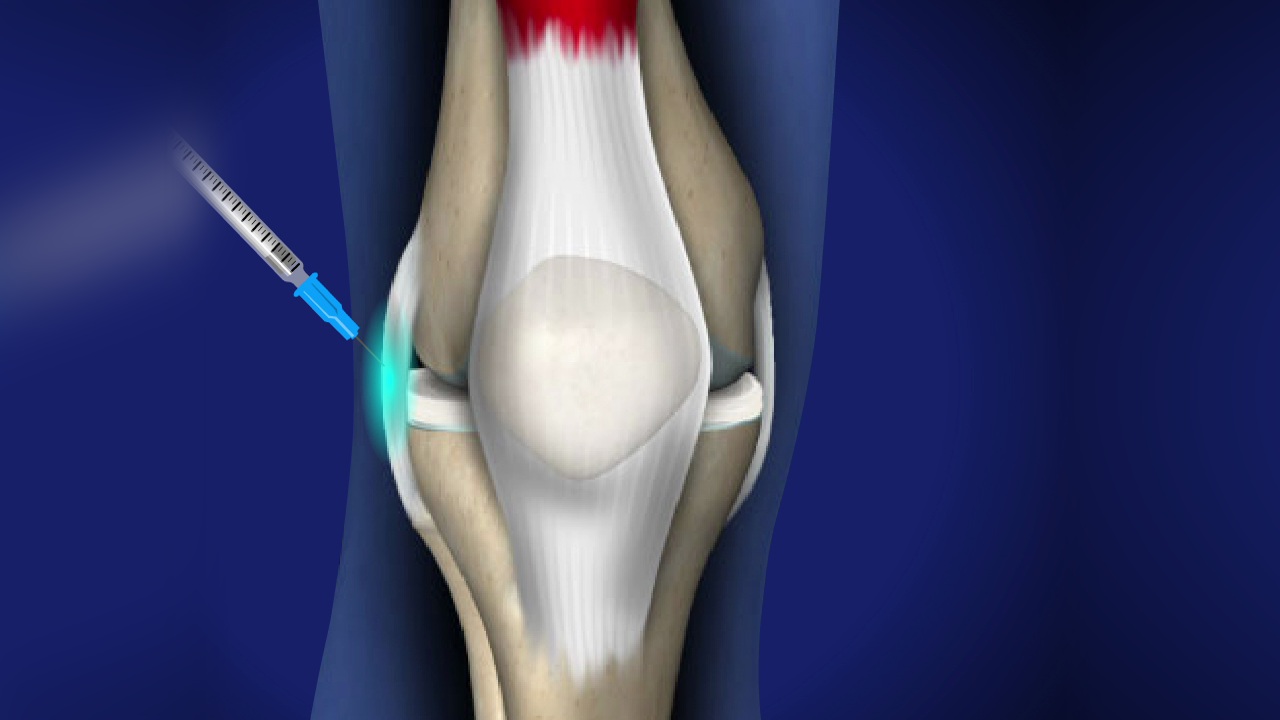 The knee is cleansed and sterilized. A local anesthetic is applied to numb the injection site.