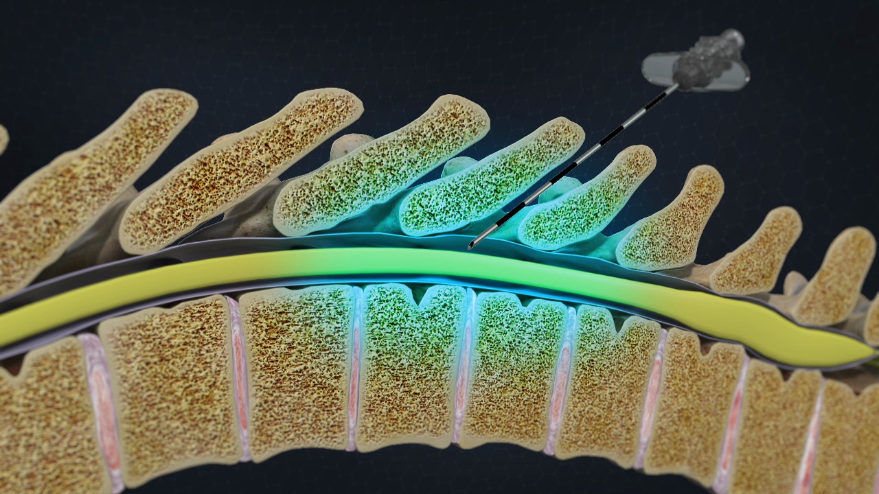 The physician uses an x-ray device called a fluoroscope to guide a needle down to the vertebra that is causing the pain. The needle is carefully pushed into the epidural space, which is the area surrounding the spinal cord. A contrast solution is injected to confirm the needle's position.