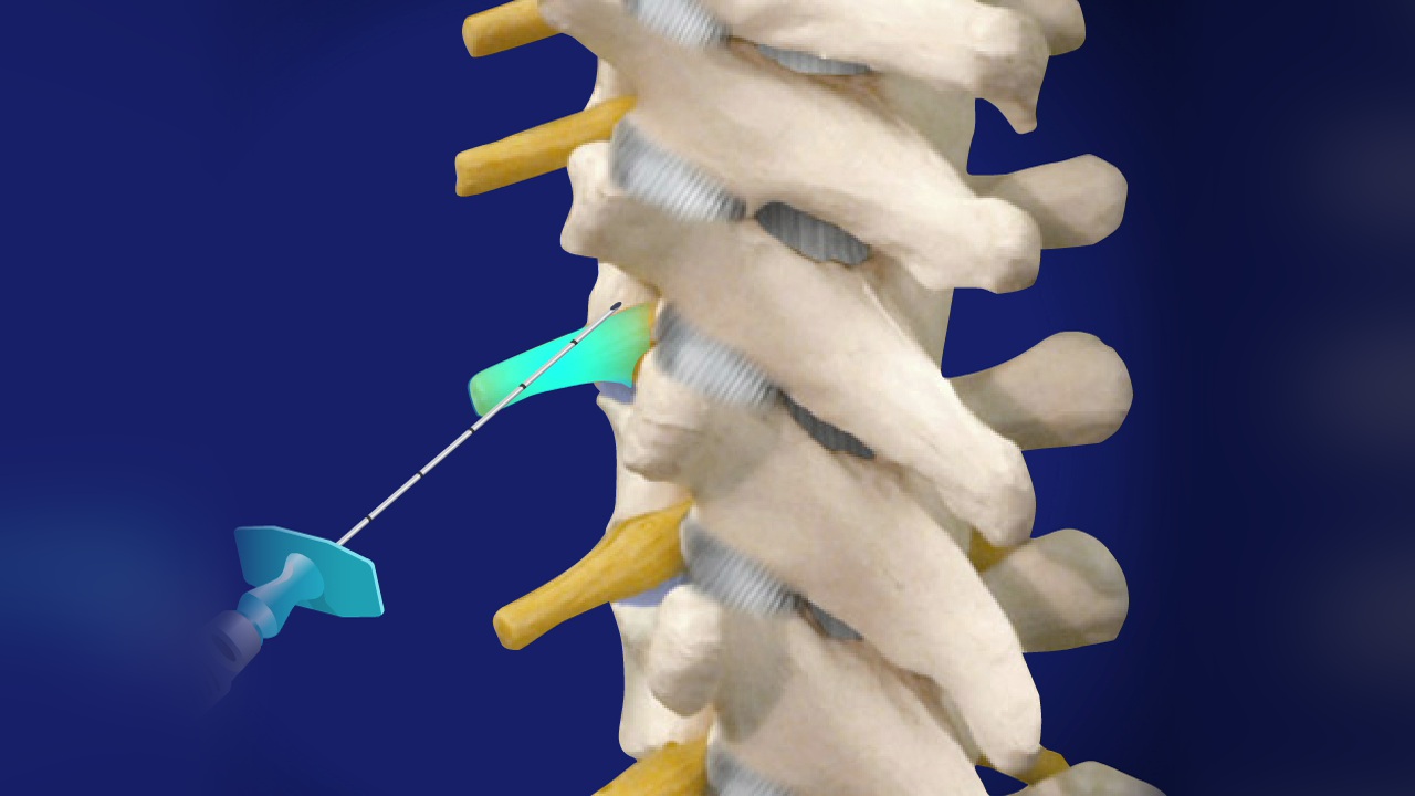 Next, we insert a needle through the numb area. We use a video device called a "fluoroscope" to guide the needle into the epidural space. That's the space around your inflamed nerve. We may inject contrast dye to make sure the needle is in the right place.