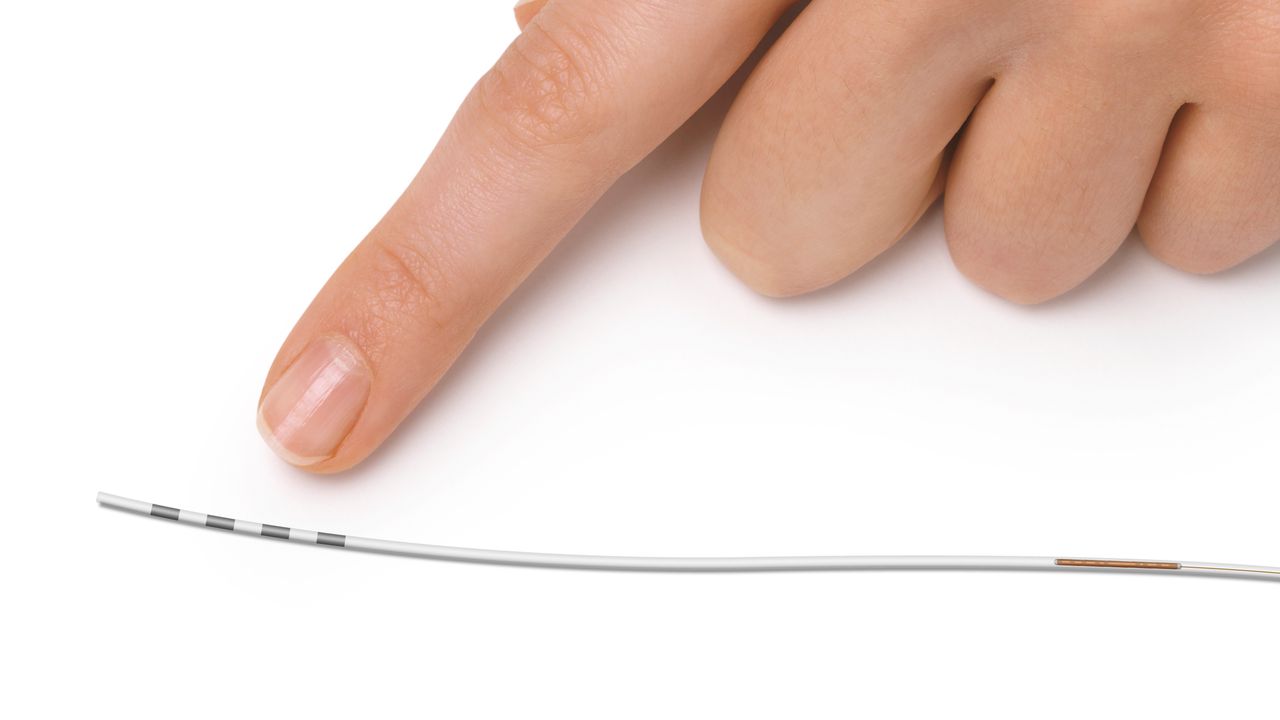 The system has three parts. The first is a tiny implant we call a "stimulator receiver." It looks like a wire. It's put in through a needle and placed next to your painful nerves. More than one may be put into your body.