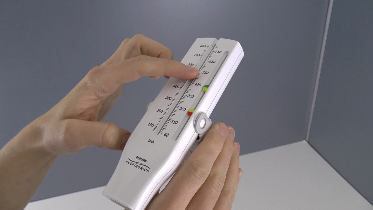 A peak flow meter is easy to use. There are many different styles, but all have a mouthpiece and a sliding indicator. To use the device, stand up if you are able. Take a deep breath. Put the mouthpiece in your mouth, creating a tight seal with your lips. Blow forcefully into the mouthpiece with a single breath.