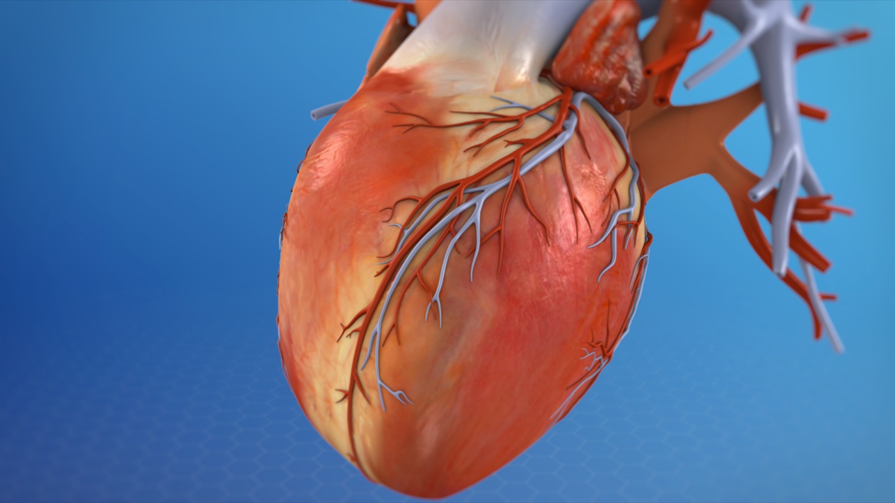 Now let's look at the heart's exterior. On the exterior of the heart are the coronary arteries and cardiac veins. The arteries supply the heart muscles with oxygen-rich blood. The veins carry away blood when the oxygen and nutrients have been depleted. In addition to these vessels, pads of fatty tissue are also found on the exterior of the heart. And finally, the entire heart is wrapped in a double-layered sac called the "pericardium."