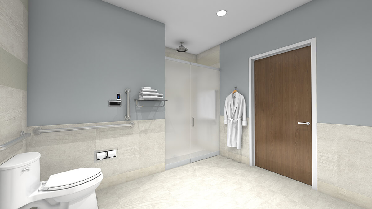 Each room will include a charging station for personal devices, a table for computer, games or snacks and en suite bathroom with a glassed-in shower, glass tiles, solid surface vanity, down-lighting, built in hair dryer, spa robe and luxury towels.