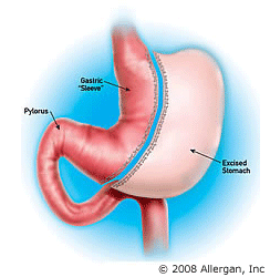 The sleeve gastrectomy is a surgery performed on the stomach (it restricts the amount of food intake) and does not involve any surgery on intestine (which would affect the amount of food and nutrient absorption). Sleeve gastrectomy has also been called partial gastrectomy and vertical sleeve gastrectomy. It basically consists of making a stomach that looks like a pouch into a long tube; therefore the name "sleeve." The sleeve gastrectomy (SG) removes two-thirds of the stomach, which provides for quicker satiety (sense of fullness) and decreased appetite. The smaller stomach pouch restricts food intake by allowing only a small amount of food to be eaten at one time. After the separation into a smaller tube, the remainder of the stomach is removed. The valve at the outlet of the stomach remains, permitting the normal process of the stomach emptying to continue, which allows for the feeling of fullness.